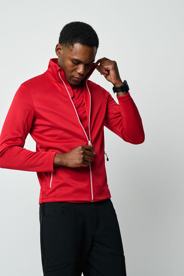 Printer RED collegetakki joustavasta materiaalista, jossa täyspitkä vetoketju ja pystykaulus. Kevyessä takissa on tehosteväriset vetoketjut ja koristeelliset flatlock-tikkaukset. Sivuilla vetoketjutaskut. Sopii hyvin aktiiviseen liikkumiseen. Vaate on värjätty ympäristöystävällisellä Spun Dyed -tekniikalla, joka kuluttaa vähemmän vettä, kemikaaleja ja energiaa. Oeko-Tex-sertifioitu.