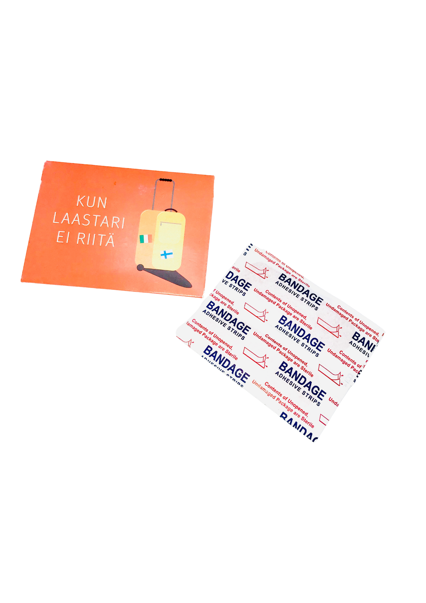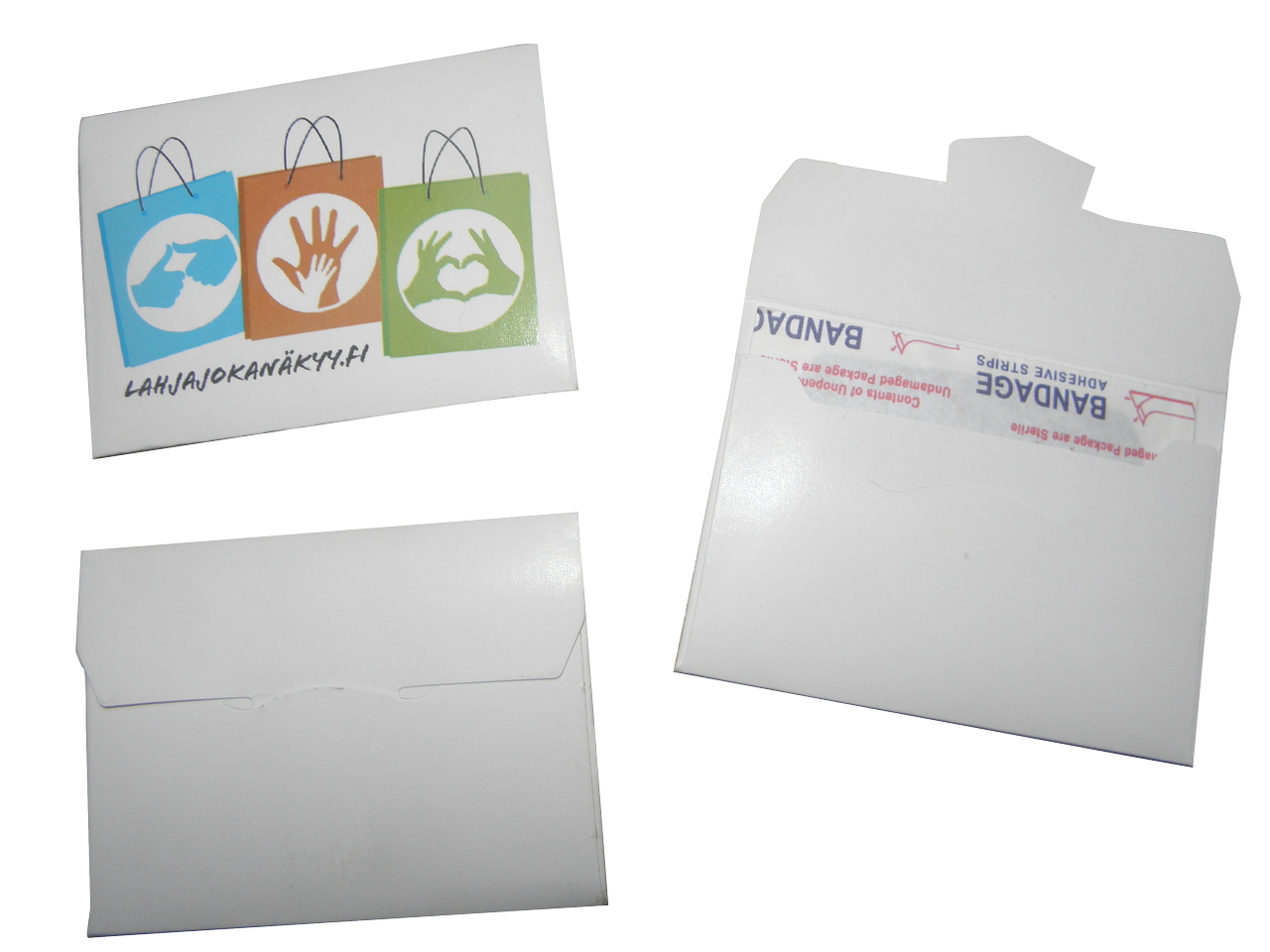 Sisältää 6 laastaria, suojapaperissa standardipainatus. Pakkauksen koko 8 × 6 cm. Hinta sisältää 4-väripainatuksen pakkaukseen.