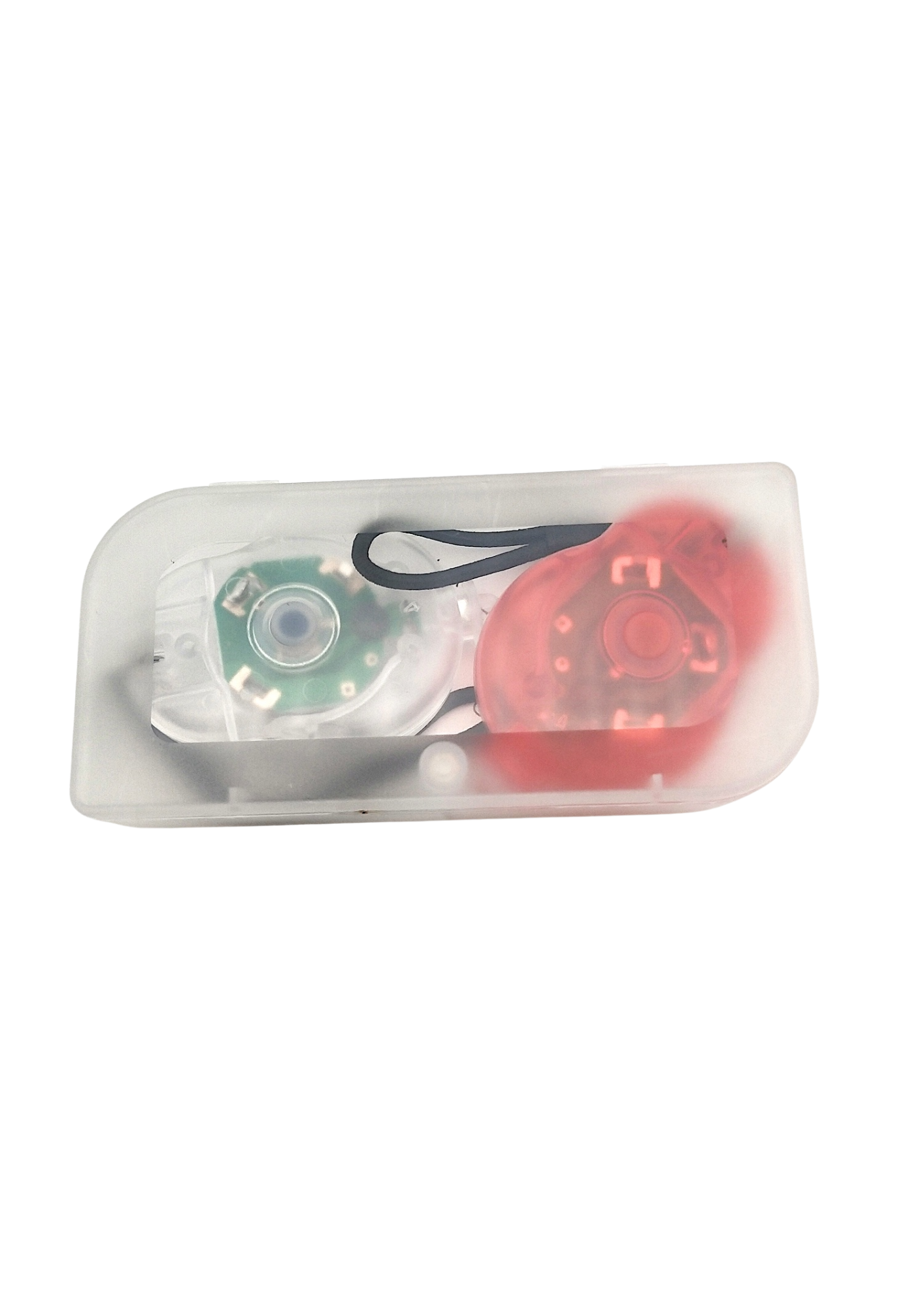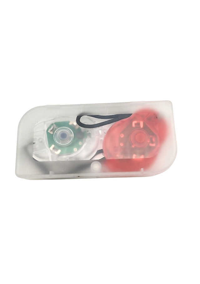 Sisältää etuvalon (valkoinen) ja takavalon (punainen). Koko 55 × 35 × 12 mm. Toimii CR2032-paristoilla. Helppo kumilenkkikiinnitys. Pakattu muovirasiaan, jossa 1-väripainatus.